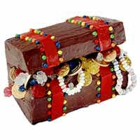 - 5 Use pull-and-peel licorice to make handles and straps. Fill chest with chocolate coins, candy necklaces, and other hard candies. Add gummy ring half for clasp. Store loosely covered.